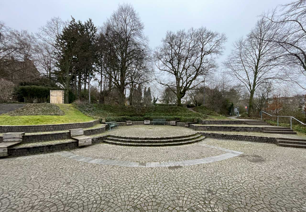 Durchmesser: 9 m, rauer Pflasterstein, Sitzgelegenheiten auf der Mauer, barrierefrei zugänglich. Perfekte Bühne für Diskussionen, Pop-up-Events mit kleinem bis mittlerem Publikum, Ausstellungen …